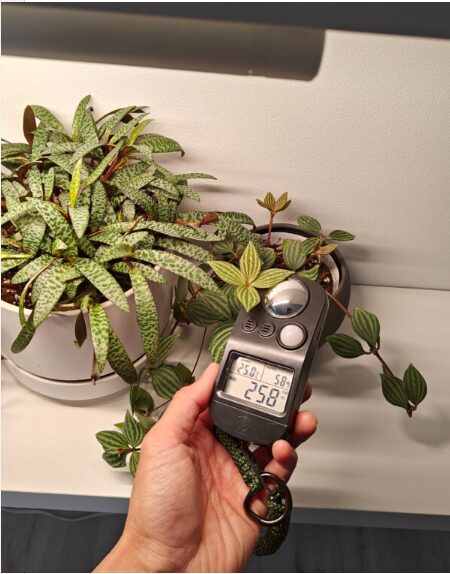 • The author used a custom-designed LTH Meter (a device that simultaneously measures light, temperature, and humidity) to measure light intensity at different distances and locations, and calculated the Daily Photosynthetically Active Radiation (DLI) to determine whether it met the needs of different plants.